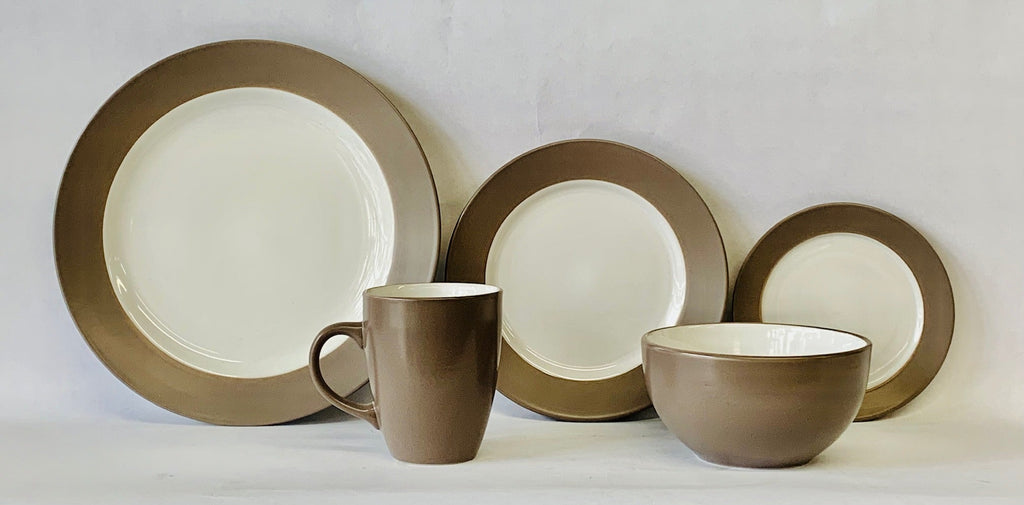 Set includes: 1-dinner plate 10.5", + 1-salad plate 8", + 1-Bread & Butter plate 6", + 1-cereal Bowl 5.5", 1-Mug 3.5".