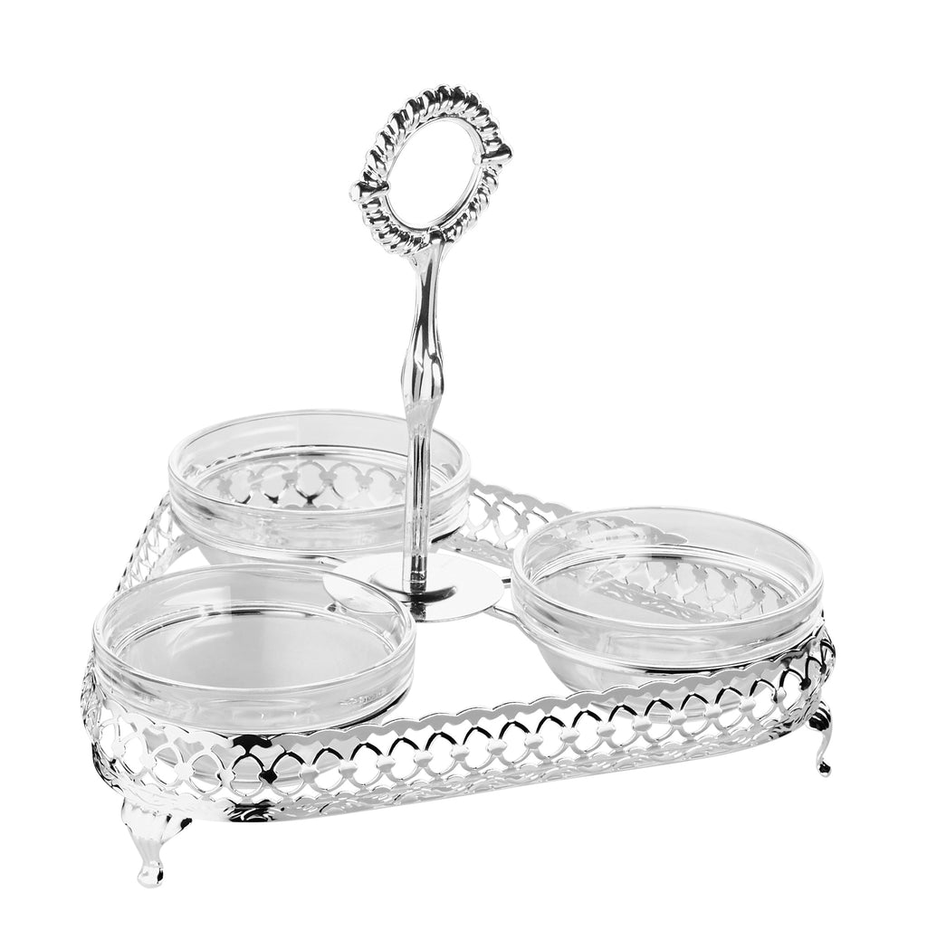 This silver plated relish set from Queen Anne is made from tarnish-resistant silver. The three piece glass relish dishes are nestled perfectly in the silver tray.